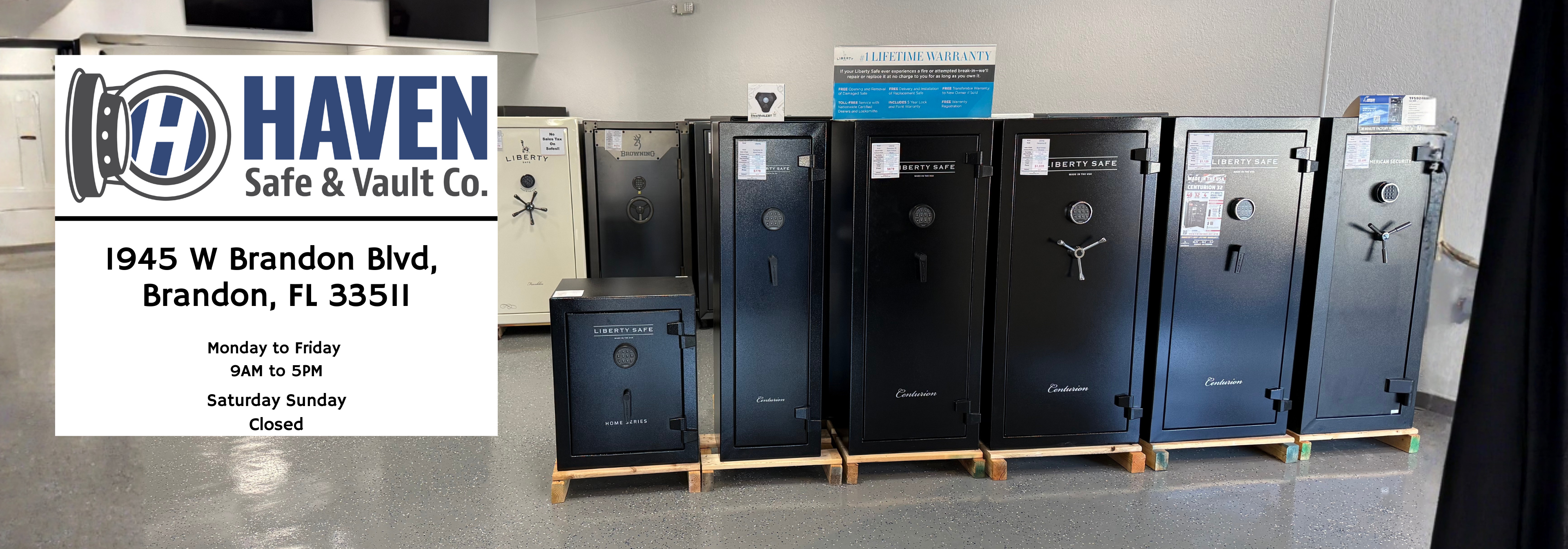 Opened in 2023 to serve the greater Tampa Bay region, our Brandon Haven Safe & Vault Co. showroom is dedicated to one thing safes and vaults. That focus shows as soon as you walk in. Our showroom is fully stocked with top brands like Browning Safes, Liberty Safe, ProSteel, American Security, Rhino Metals, and Vaultek so customers can compare sizes, fire ratings, burglary protection, and features side by side. Hillsborough County shoppers often look for home safes and high security gun safes because they provide excellent storage and peace of mind.