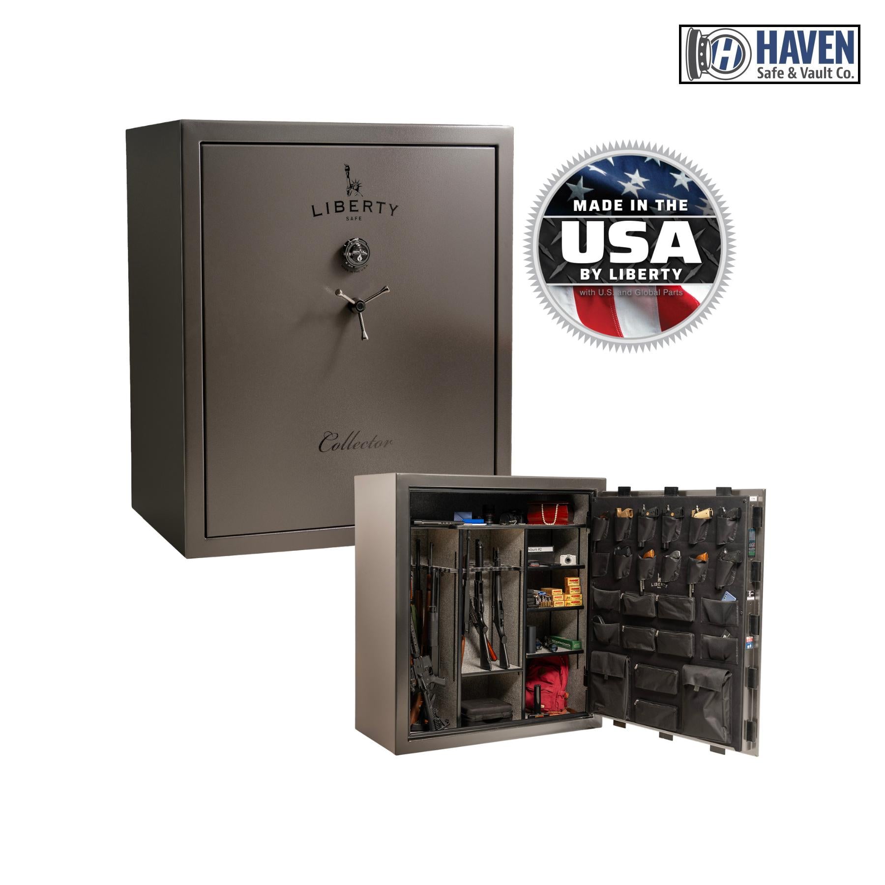 Built for serious collectors, the Liberty Collector 50 Gun Safe combines classic American styling with top-tier protection. Its 110-minute fire rating at 1200°F and UL-listed security ensure your firearms and valuables stay safe from both fire and theft. With storage for up to 50 long guns and an upgraded interior featuring adjustable shelving and Liberty’s deluxe door panel, this safe offers premium functionality and timeless appeal. Finished in a bold two-tone exterior, it’s as much a showpiece as it is a fortress.